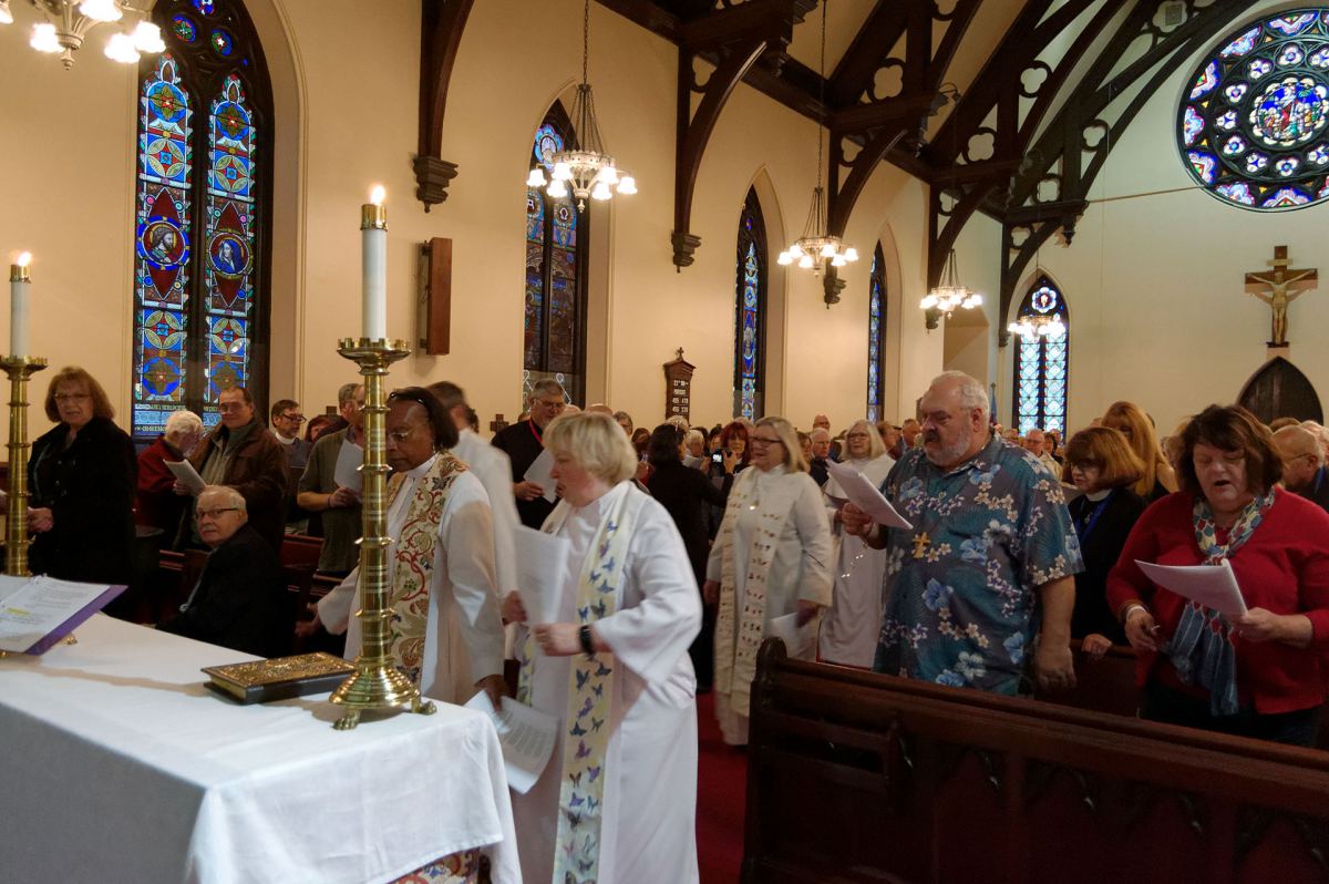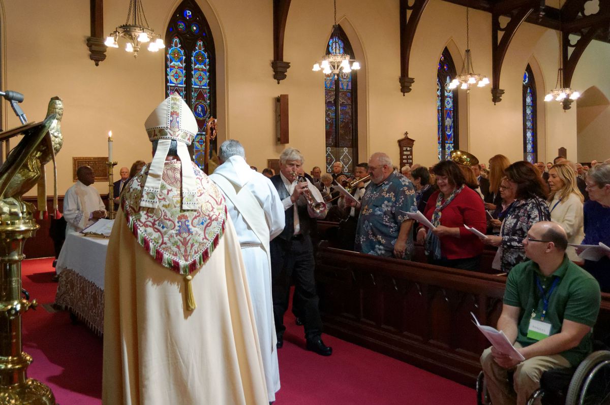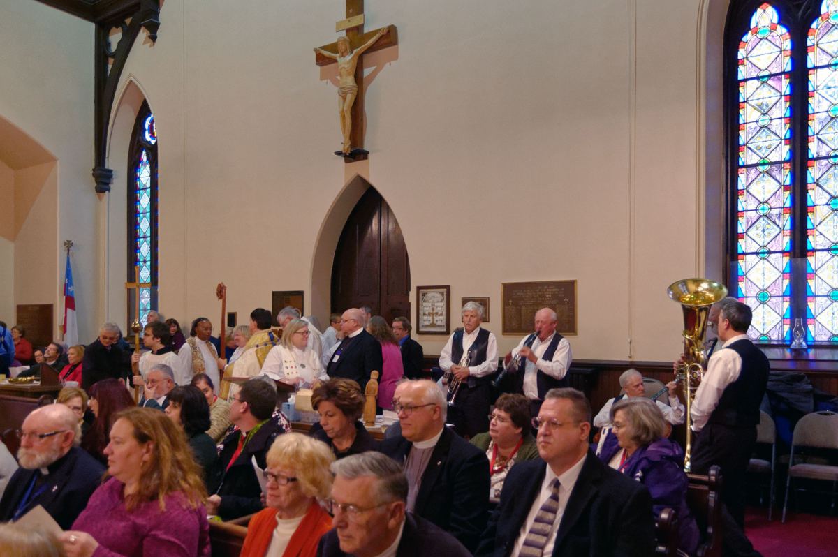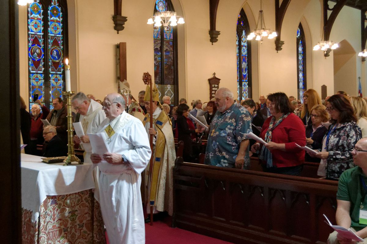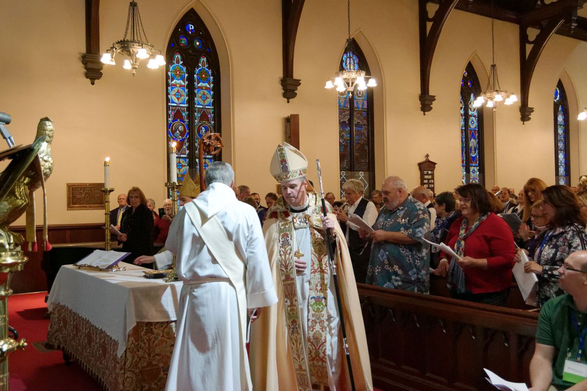 Last year the Diocesan Convention Eucharist was held at St. Peter’s Church on October 26th at 6 pm. Attendance was overwhelming with over 300 people in the nave, and many others in an overflow area. A Dixie land band played upbeat music before the Service. The band continued to play “When the Saints go marching in” as Bishop Franklin and clergy processed up the center aisle into the chancel. The 2018 Diocesan Convention was significant in that it was Bishop Franklin’s last Convention. Franklin will be retiring as Bishop of the Diocese of Western New York, in April 2019, when he will “Pass the Crozier” to Bishop Sean Rowe, who heads the Episcopal Diocese of Erie, and was elected Provisional Bishop for the Diocese of Western New York at this Convention.