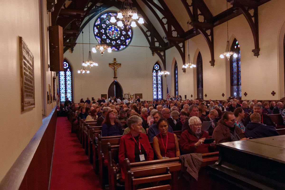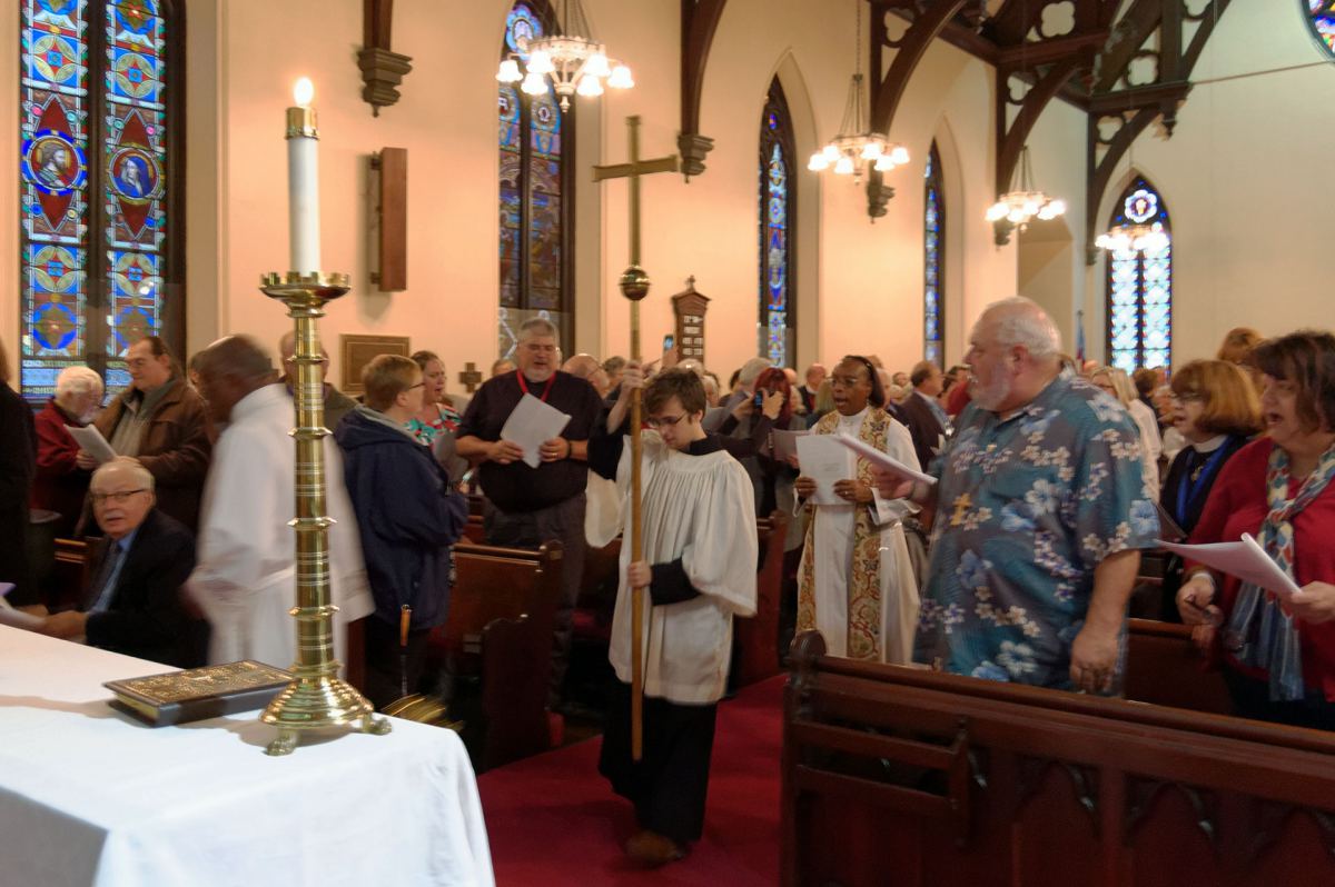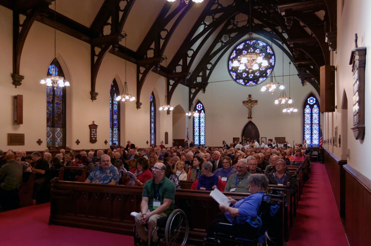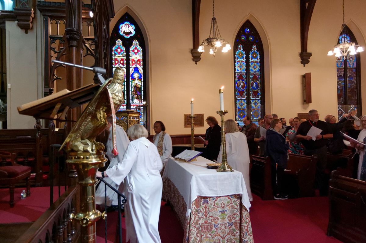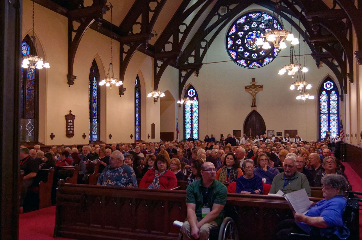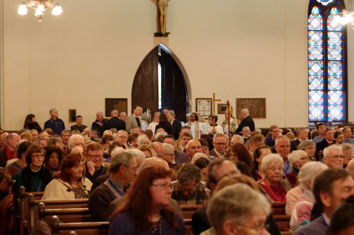 Last year the Diocesan Convention Eucharist was held at St. Peter’s Church on October 26th at 6 pm. Attendance was overwhelming with over 300 people in the nave, and many others in an overflow area. A Dixie land band played upbeat music before the Service. The band continued to play “When the Saints go marching in” as Bishop Franklin and clergy processed up the center aisle into the chancel. The 2018 Diocesan Convention was significant in that it was Bishop Franklin’s last Convention. Franklin will be retiring as Bishop of the Diocese of Western New York, in April 2019, when he will “Pass the Crozier” to Bishop Sean Rowe, who heads the Episcopal Diocese of Erie, and was elected Provisional Bishop for the Diocese of Western New York at this Convention.